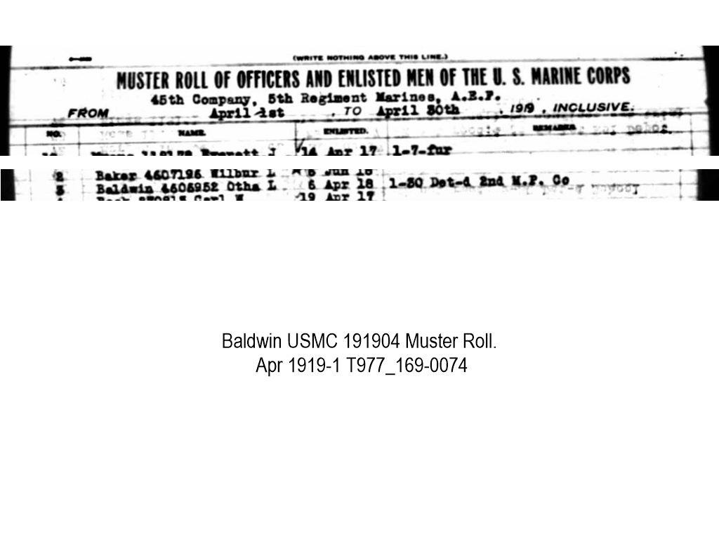Baldwin Otha L USMC Muster Roll -- Apr 1919