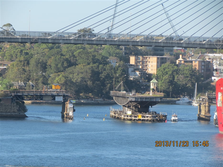 Here you can see an older turntable-type bridge under the newer ANZAC bridge. The turntable is now permanently locked open to alow ships to pass thru. It looked to me like the deck of this older bridge is now used as a car park (as they call parking lots) (IMG_5819.SX40.JPG)