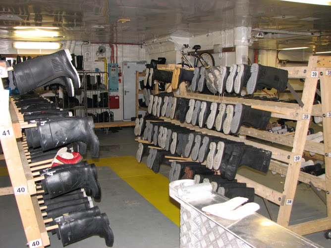 The ship supplied boots to use during landing. The boots were stored in this room on Deck 2, near where we entered the boats (the boats were pulled inside the ship and stored in same this general area between landings). The boots are on racks, sorted by shoe size.