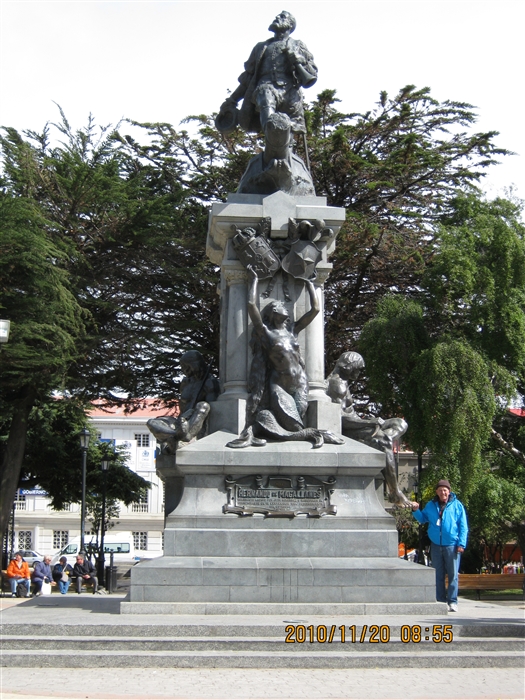 Punta Arenas, Chile. This is in the main town square. Bob Anderson is holding a foot of one of the Native South Americans that are on the statue. A photo similar to this is also on his web site. Apparently he and Jan were here taking photos at the same this this photo was taken.