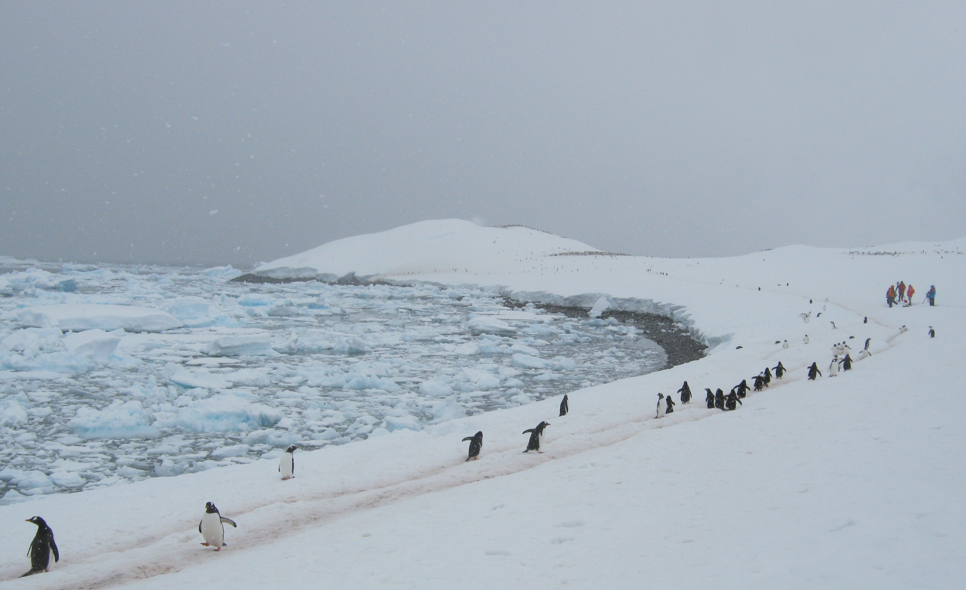 Line of penguins moving (between rookeries? or maybe to and from an area where it's easier for them to enter and exit the water?). Notice they have two lanes in the snow.