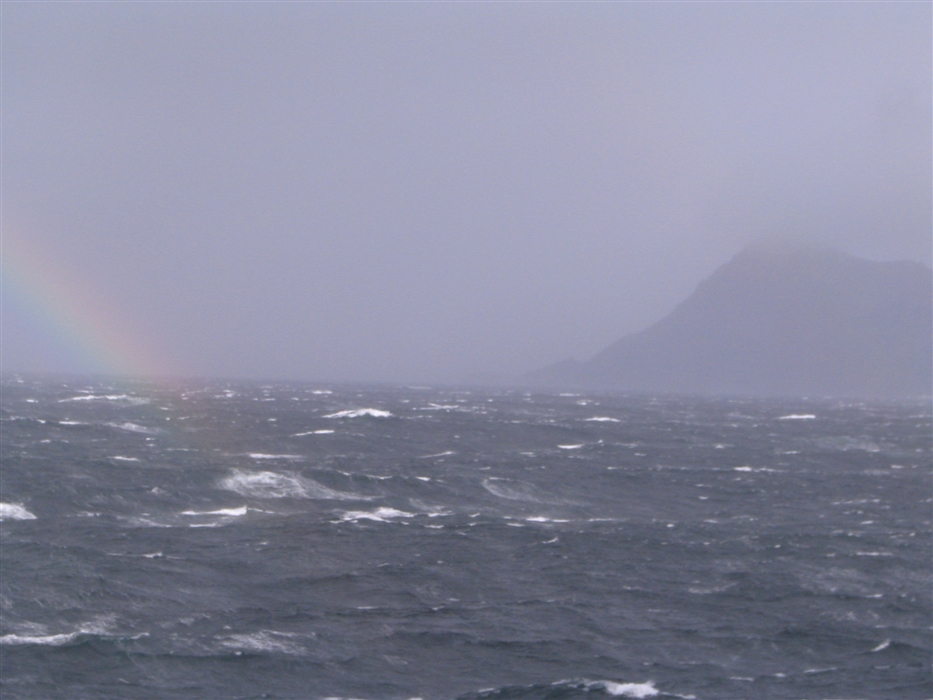 Taken from the Drake Passage (or, perhaps, from near the Drake Passage, which might not start until you get past Cape Horn). Cape Horn is the dark land mass on the left hand side. That's a rainbow on the left.