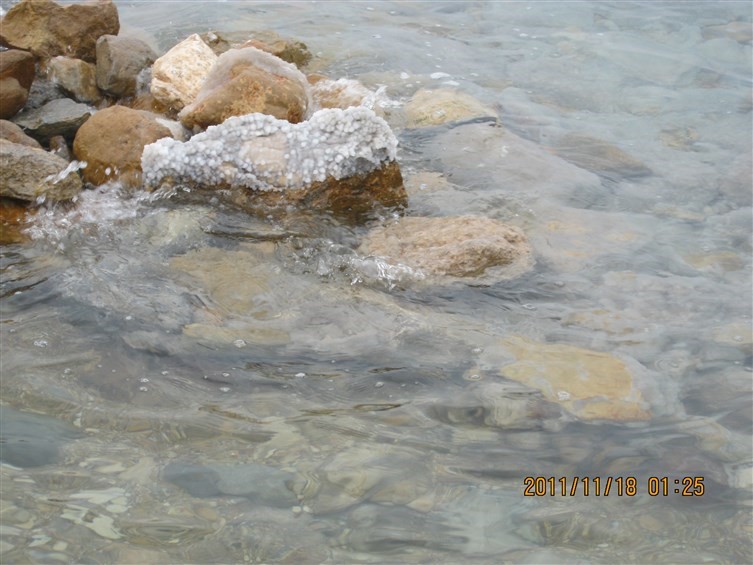 Rocks at the edge of the Dead Sea are encrusted with salt deposits.