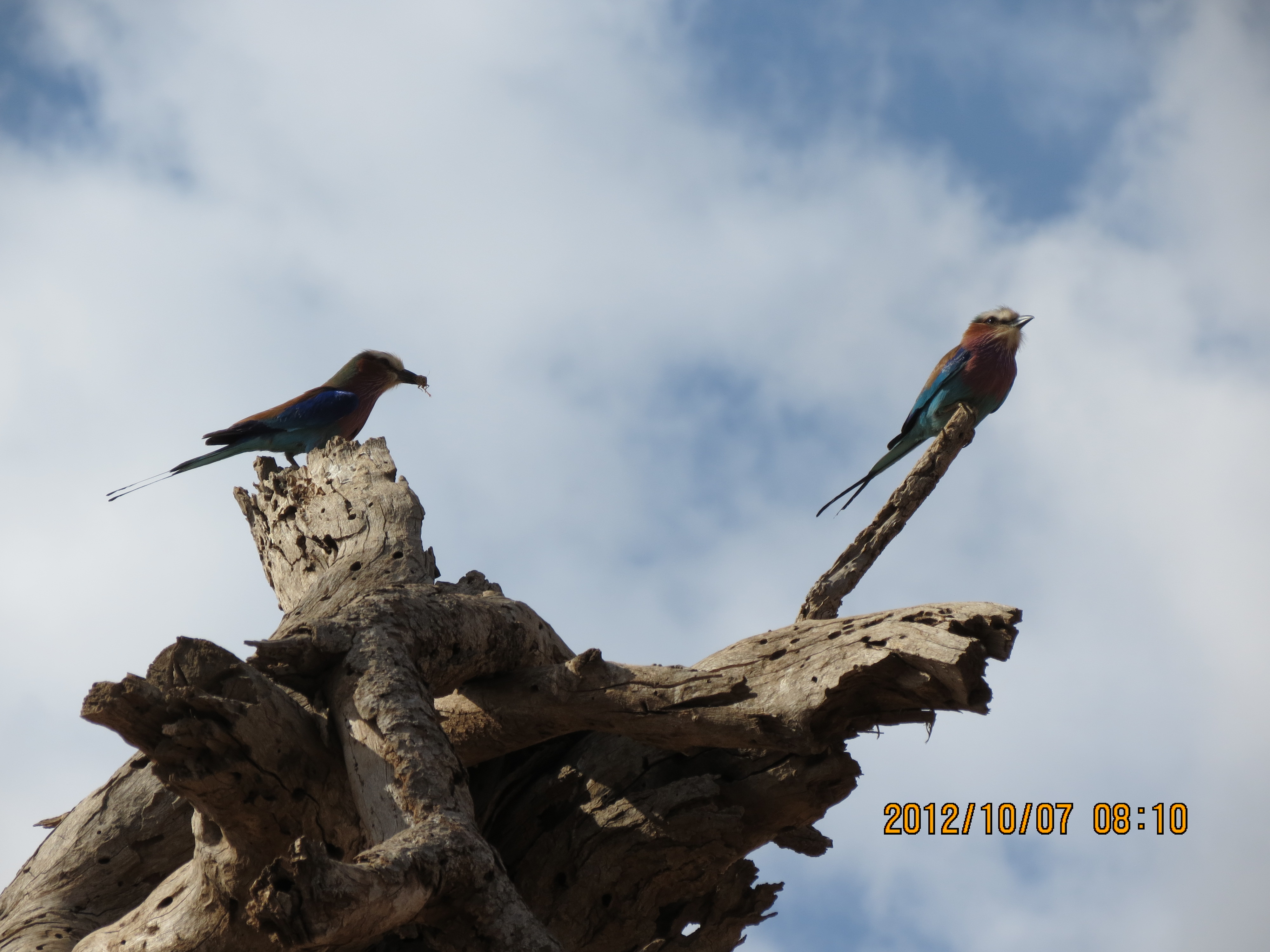 The bird on the left is probably a superb starling and the one on the left might be a lilac-brested roller. My memory is that we saw a lot of the superb starlngs (who were often identified as such by the driver guides). After returning home, sorting and editing these photos, and going over photos with the bird ID books (and noting the geographical range of the superb starling as indicated by one of the books), I now suspect that SOME (perhaps one or two) of the birds I have indicated here as superb starlings might indeed be other kinds of starlings.