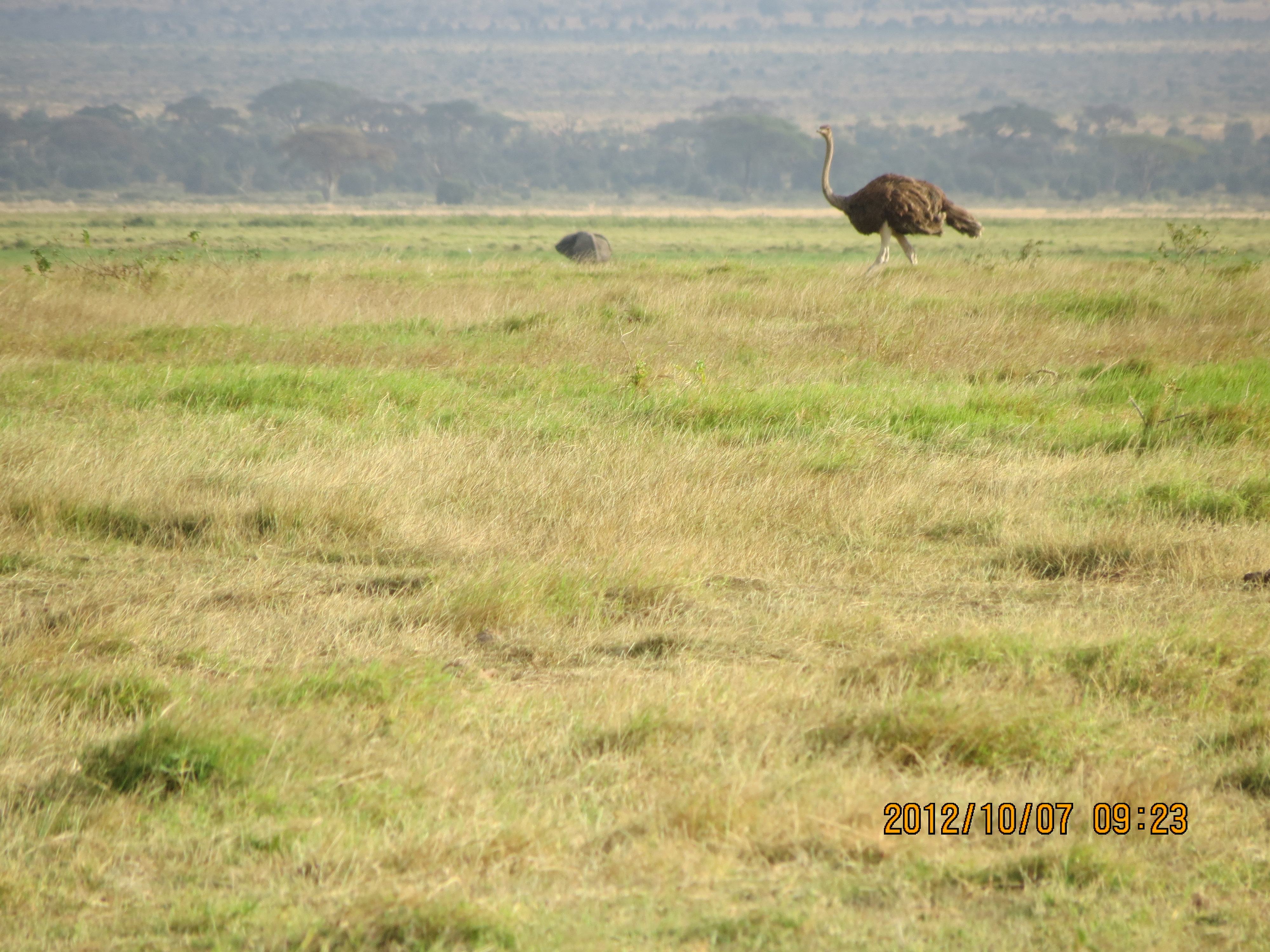 Better ostrich photo. Looks like the rear end of an elephant in the background, possibly standing in a marshy depression.