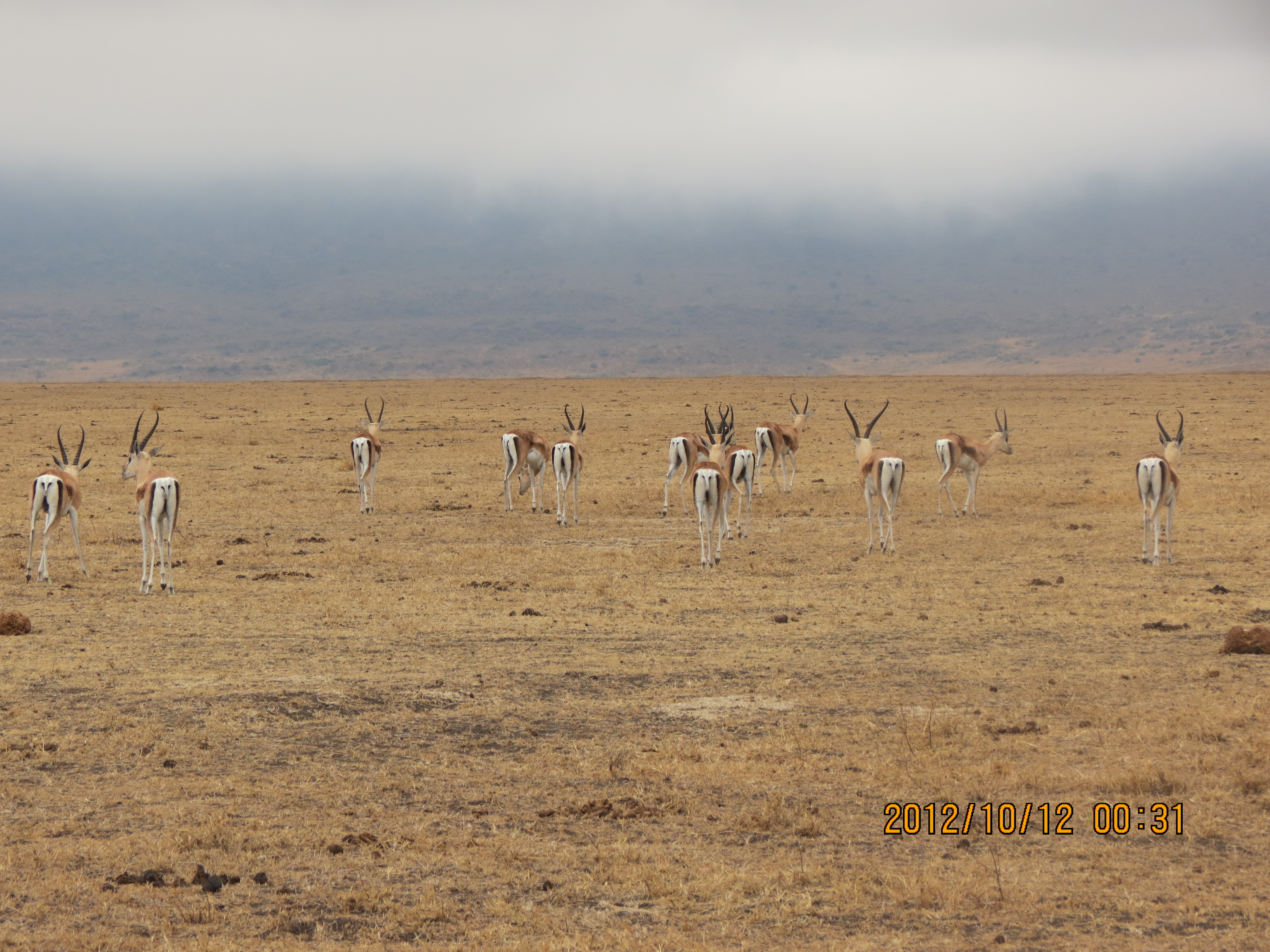 I believe these are Grant's Gazelles (as is the one in the preceding photo). They have white fur higher up on their rear ends than the also-common Thompson's Gazelles, which we also saw a lot of. I understand there are several existing species of gazelles. However, Thomspson's and Grant's were the only two pointed out to us on this trip. If there were others, I missed them.