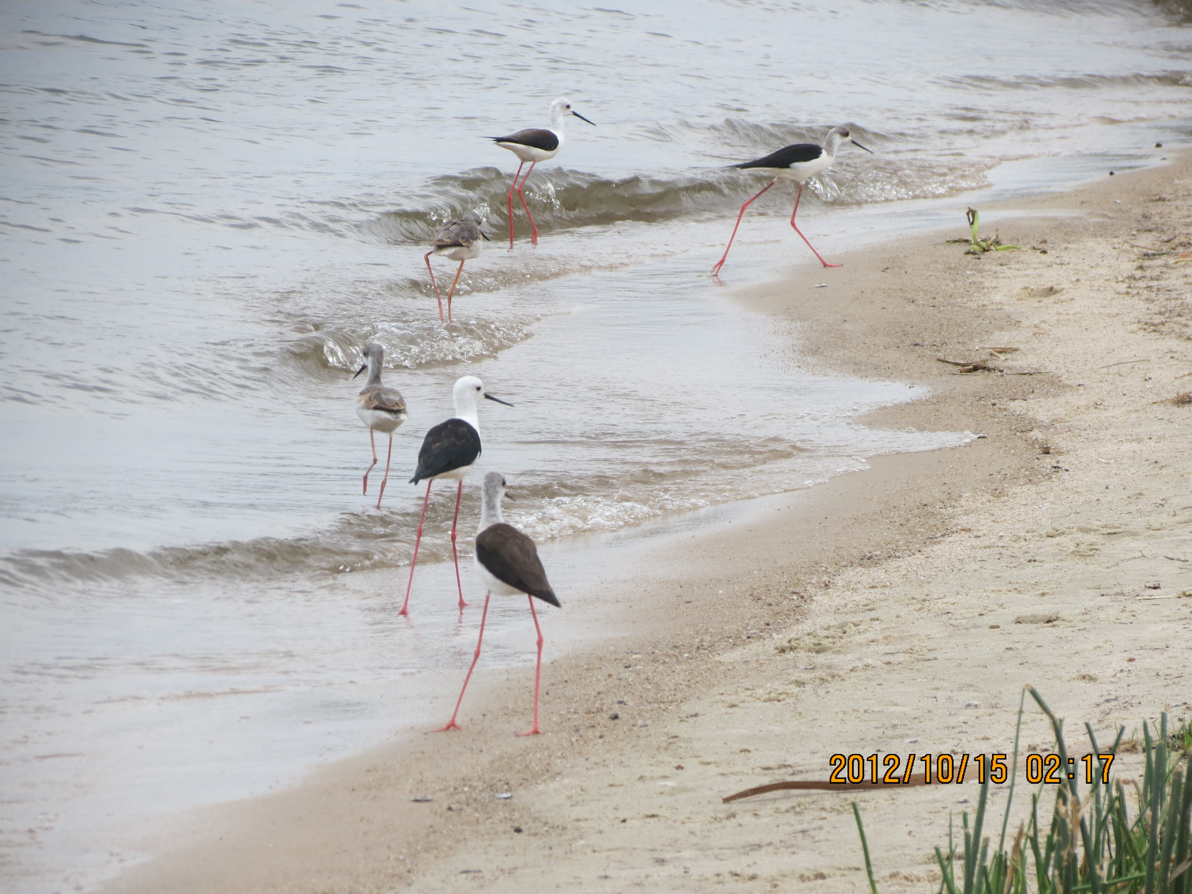 The black and white birds are Black-winged Stilts. I'm not sure about the ones with the gray on top of their bodies and on their heads.