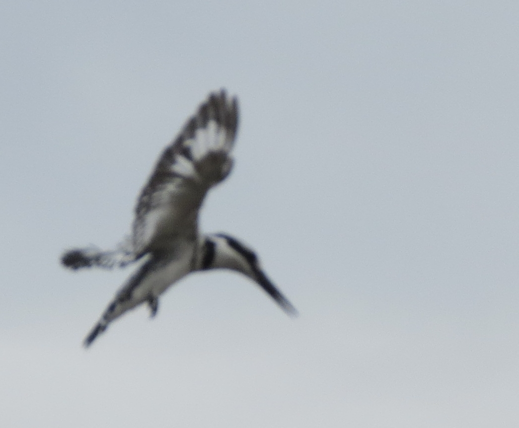 Kingfisher? This was cropped from a much larger photo. Going thru the bird ID books, this probably looks most like a Pied Kingfisher. However there are some differences, between what is seen there and the book's drawing of a Pied Kingfisher.