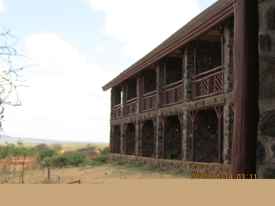 Guest wing. This view is from the water hole side. Each room has a balcony or patio seating area facing the water hole.